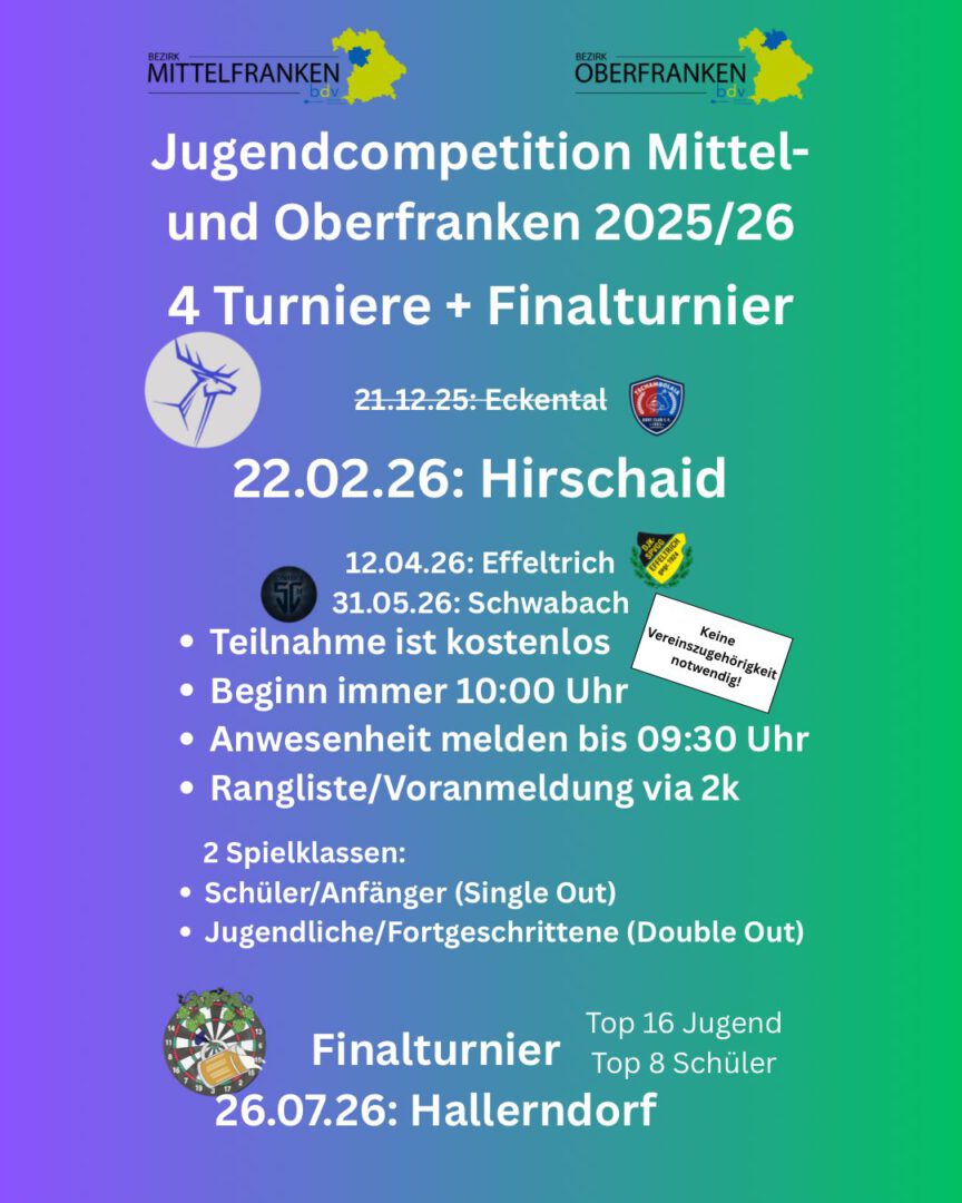 Die Jugendcompetition Mittel und Oberfranken 2025 2026 ist eine Dart Turnierserie für Kinder und Jugendliche in Bayern. In vier Turnieren und einem großen Finalturnier treten Nachwuchsspieler aus Mittelfranken und Oberfranken gegeneinander an.