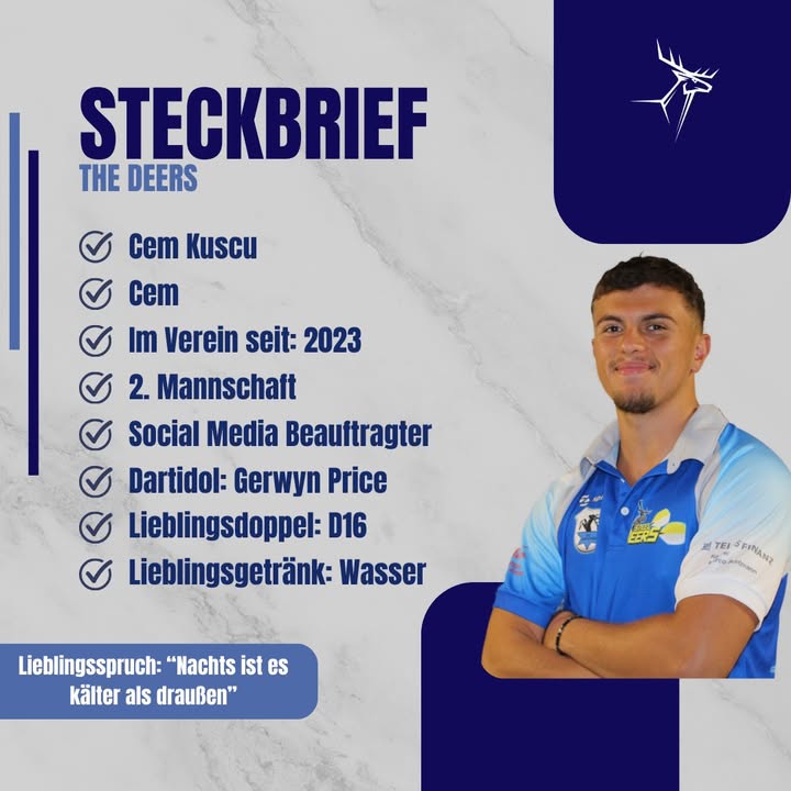 9. Januar 2025 NOBDV-Bezirksliga Sponsor der Deers Heute gibt’s wieder einen Steckbrief! Diesmal stellen wir euch Cem Kuscu vor. Er ist Teil von Team 2 und kümmert sich zudem um die Betreuung unserer Social-Media-Kanäle. Share: Tags: darts thedeers tsvhirschaid Daniel administrator
