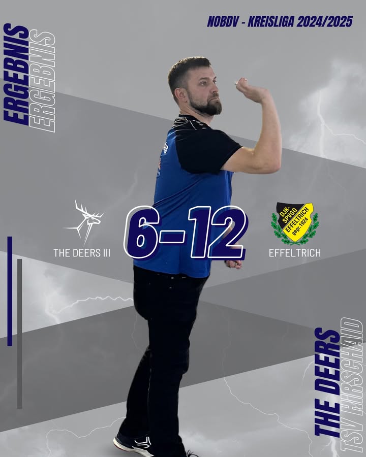 29. April 2025 NOBDV-Bezirksliga Sponsor der Deers Trotz starker Phasen unterliegt unsere Dritte der 1. Mannschaft aus Effeltrich mit 6:12. Der erhoffte erste Saisonsieg in der Kreisliga bleibt damit weiter aus â aber: die Entwicklung stimmt, und der nĂ€chste Schritt kommt bestimmt bald. đȘ Kopf hoch! Share: Tags: darts thedeers tsvhirschaid Daniel administrator